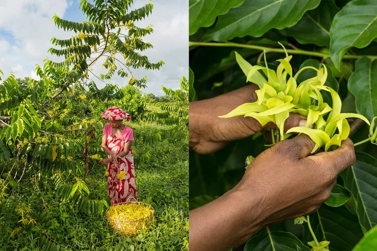 گلهای یلانگ یلانگ برای استخراج اسانس تازه برداشت میشوند و برای تولید یک کیلوگرم اسانس، حدود ۳۵۰–۴۰۰ کیلوگرم گل لازم است، در حالی که در مقایسه با سایر گلها، این میزان نسبتا بازده خوبی دارد. برداشت گلها معمولاً در ساعات اولیه صبح (بین طلوع آفتاب تا ۹ صبح) انجام میشود، زمانی که رایحه آنها در اوج خود است. گلها باید کاملاً بالغ باشند و نقطه قرمزی در پایه گلبرگهای طلایی داشته باشند تا برداشت شوند.